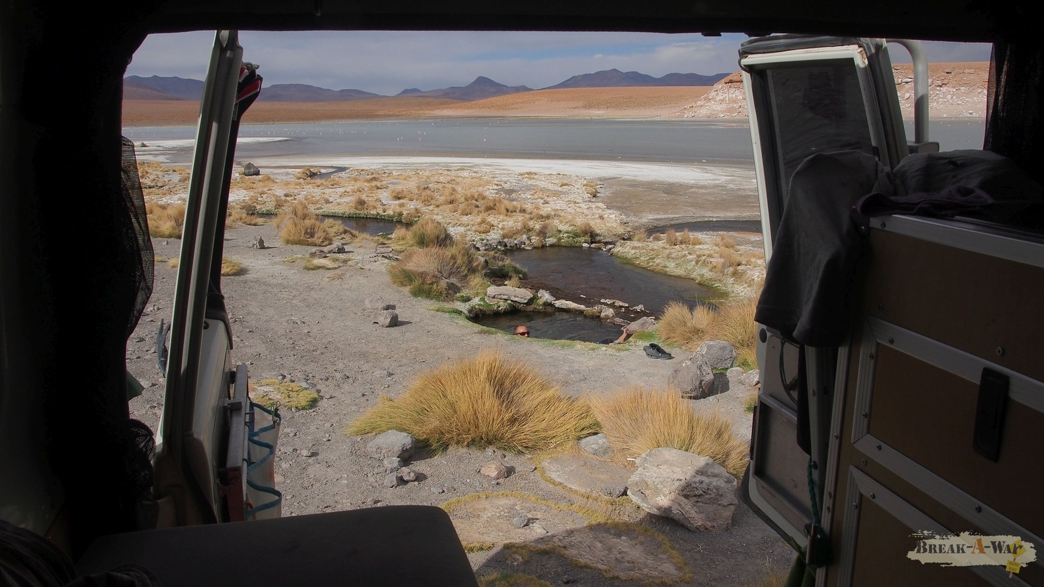 Am letzten Abend gönnen wir unseren sonne, wind- und kältegeplagten Körpern ein Bad in den heissen Quellen an der Laguna Chalviri