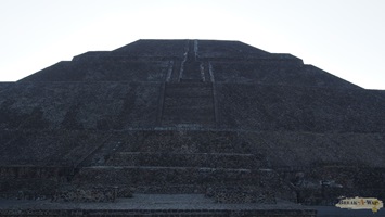die Sonnenpyramide. Leider liegt die gewaltige Treppe noch im Schatten,