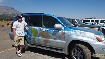 SUV um die Welt fährt und überall Souvenirs von seinem Lieblingsclub FC