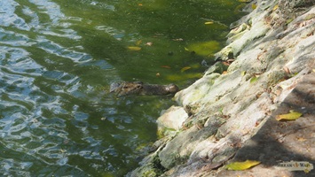 Meter hinter uns liegt eines der genannten Tiere im Wasser und blinzelt