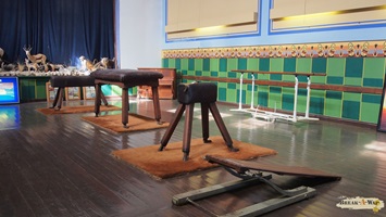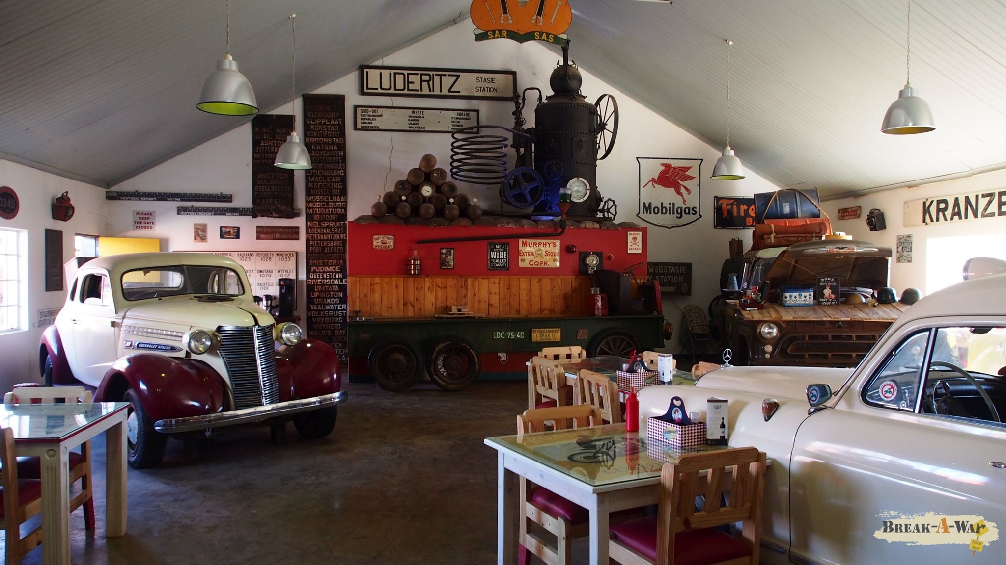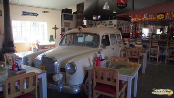 Restaurant. Die Tische sind um Oldtimer und antike Maschinen gruppiert,