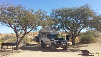 Campplatz. Wir suchen uns den schönsten Platz unter zwei Kameldornen –