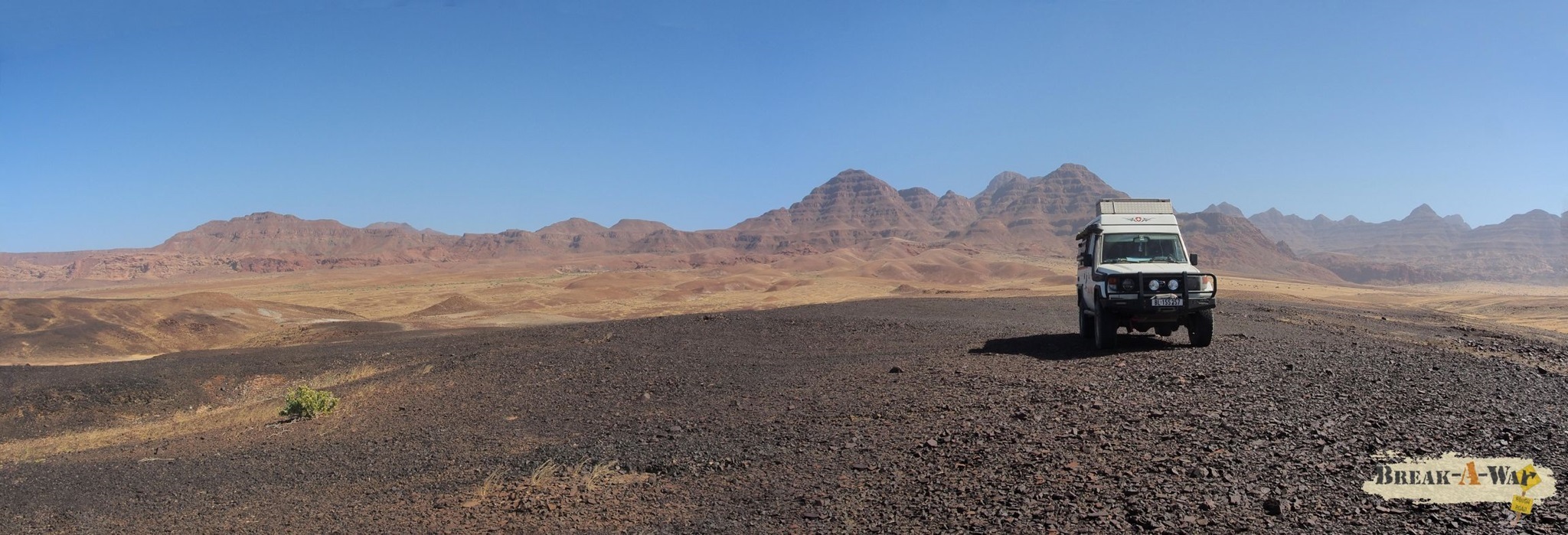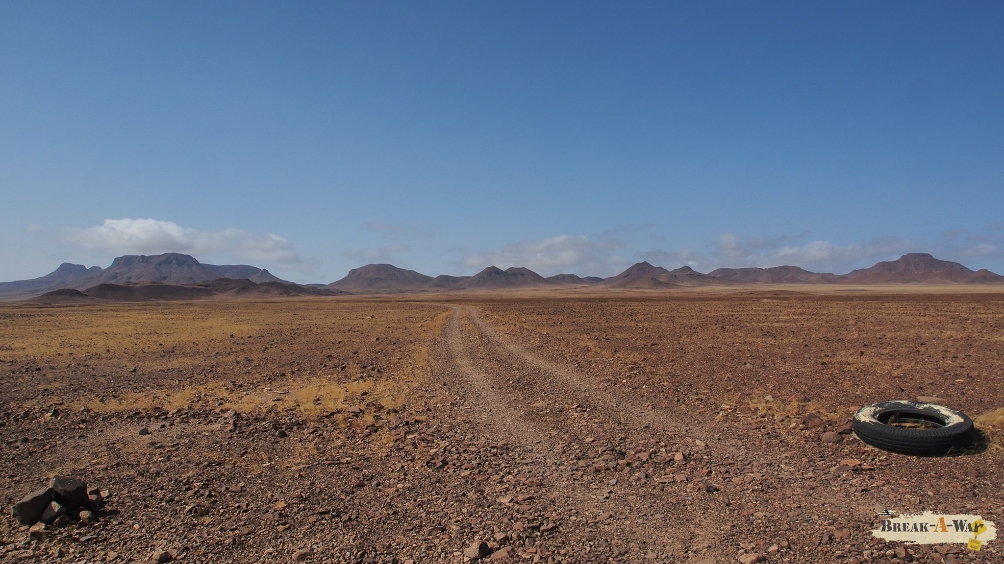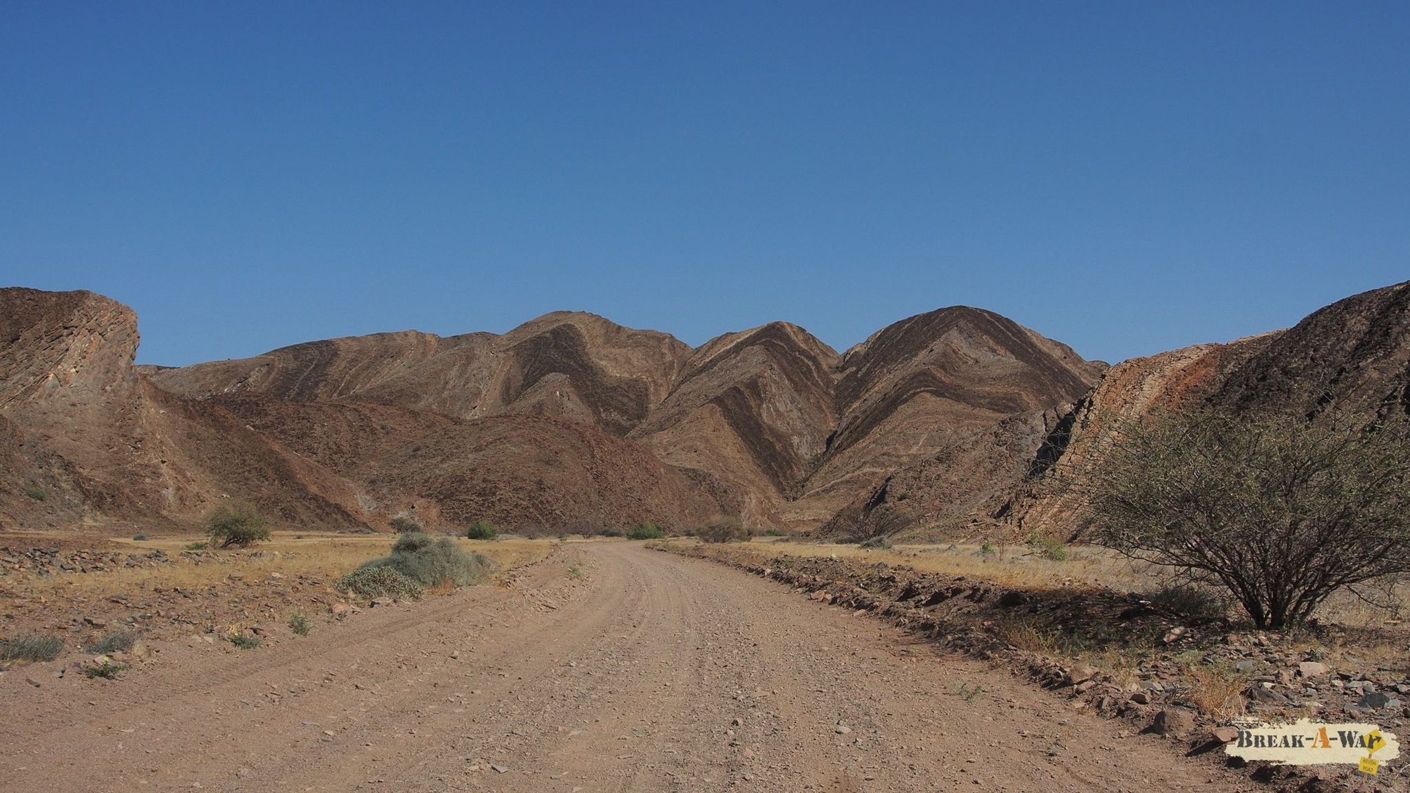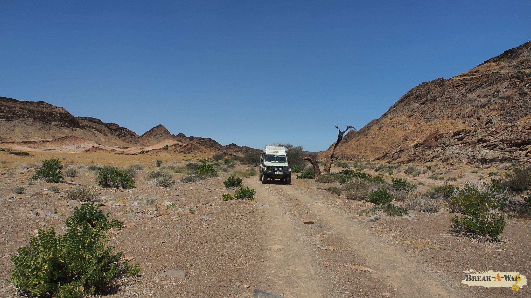 Auf steinigen mühsamen Pisten verlassen wir das Marienflusstal bei der Roidroom (rote Tonne). Wir müssen einen weiten Umweg nach Süden fahren, der direkte Weg nach Osten führt über den Van Zyls-Pass, doch