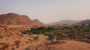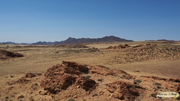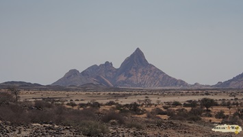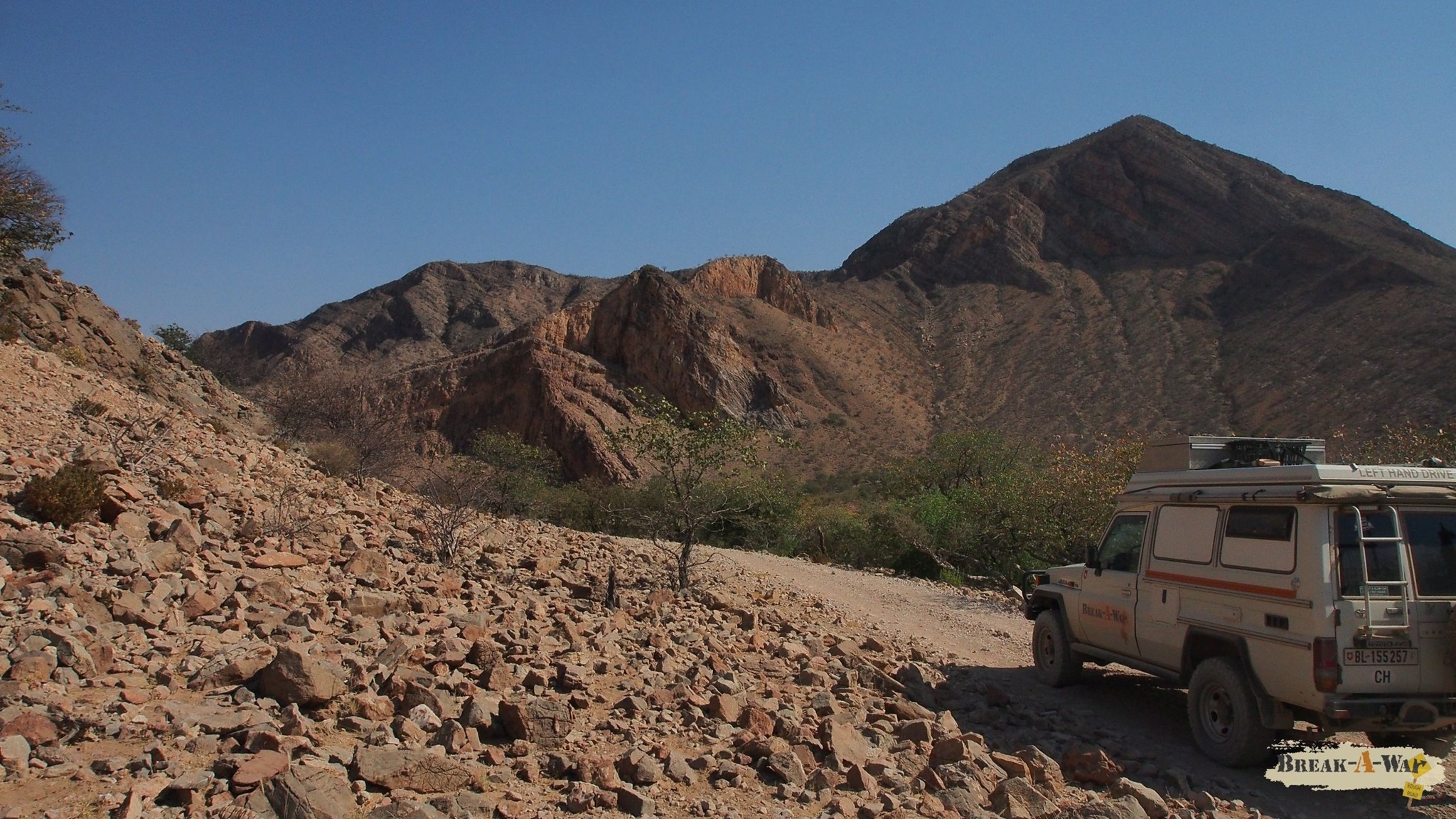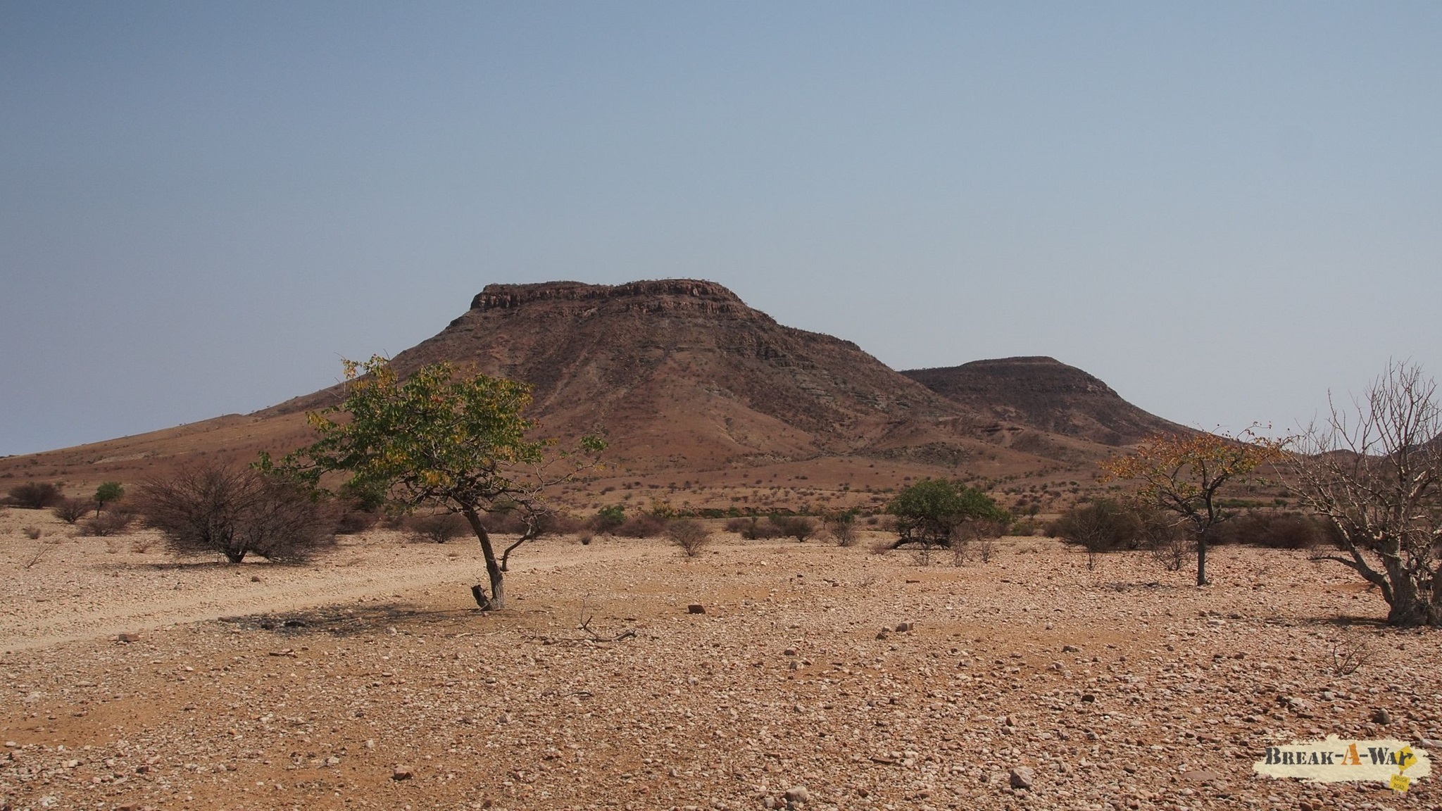 Am nächsten Morgen geht die Fahrt in den Norden weiter. Vor uns erhebt sich das Brandbergmassiv mit Namibias höchstem Berg, dem 2'573 Meter hohen Königsstein. Das Massiv ist ein bekanntes Klettergebiet und