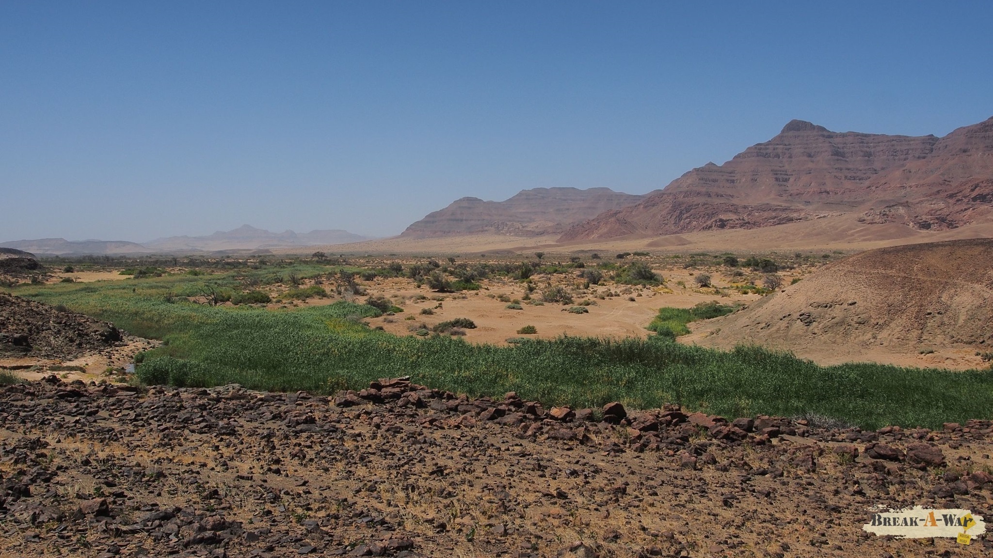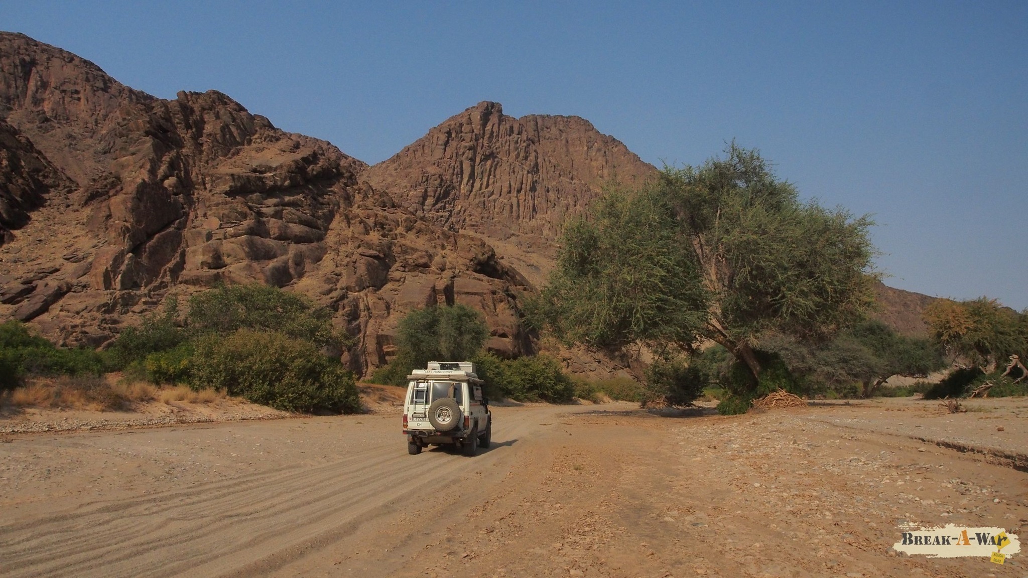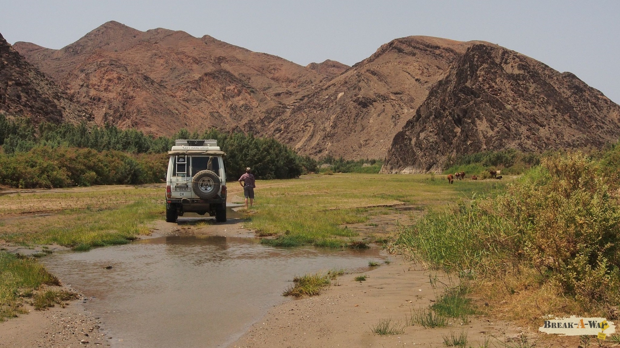 Durch das schmale Copper Valley, vorbei an alten Minenstätten rumpeln wir hinunter in das grüne Tal des Ugab-Rivers.