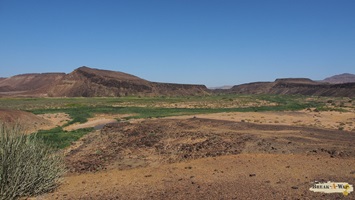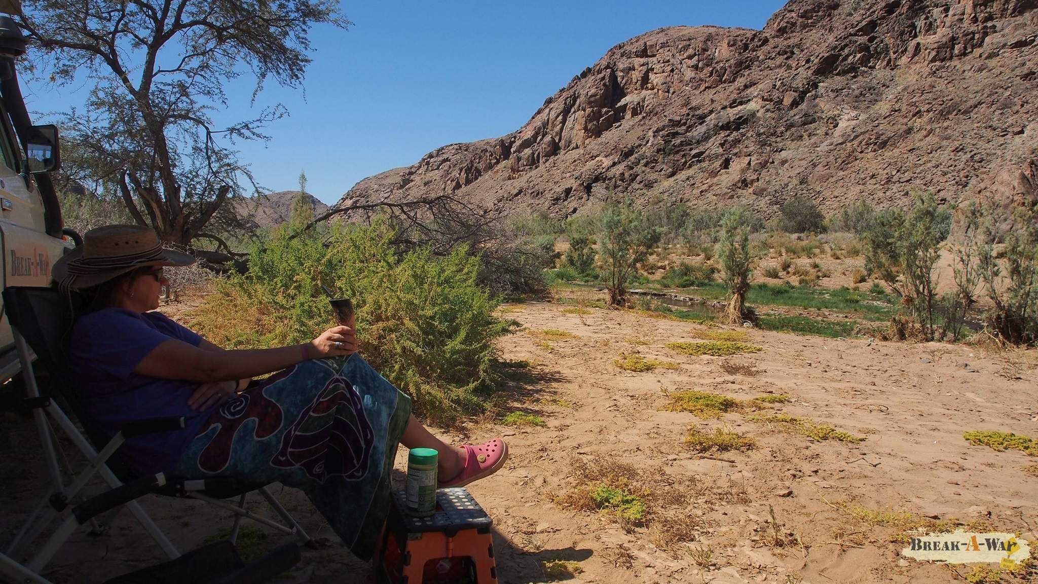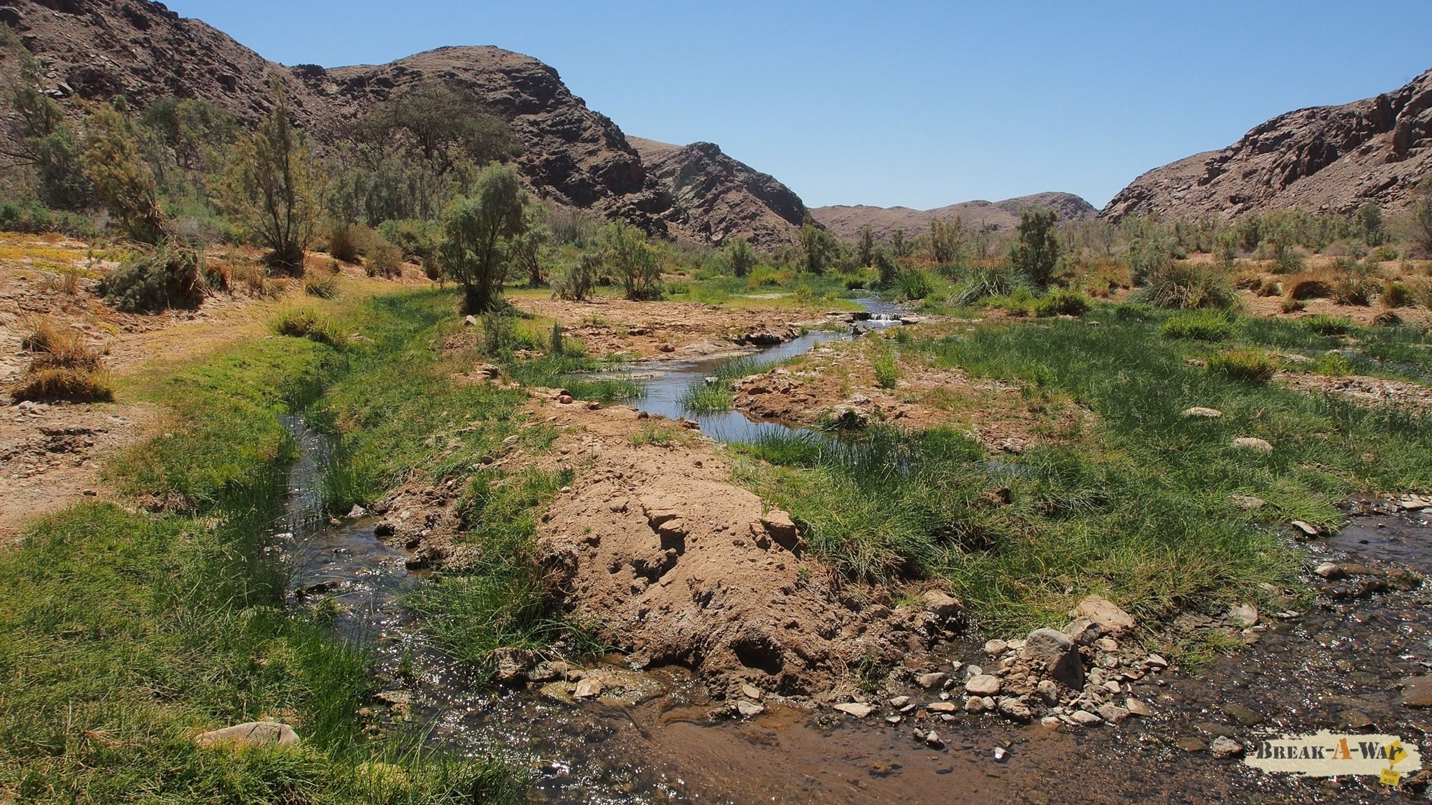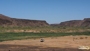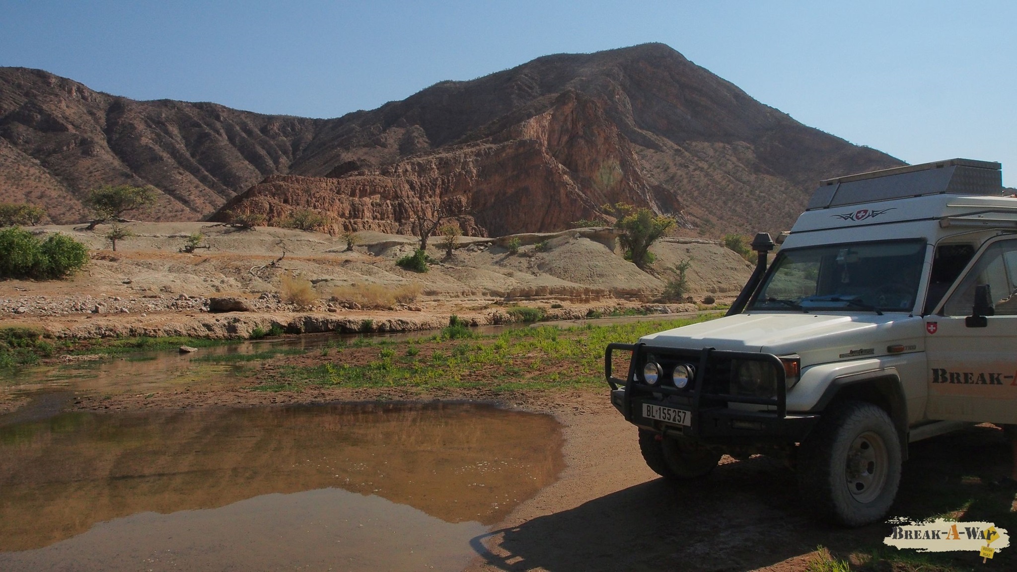 Durch das schmale Copper Valley, vorbei an alten Minenstätten rumpeln wir hinunter in das grüne Tal des Ugab-Rivers.